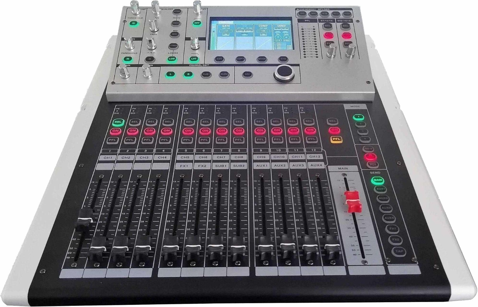16路信号输入(12路MIC输入1组立体声输入1组数字输入),内置压限器,高低通,5段参量均衡,延时,声像平衡调节。8路信号输出(主输出L,R,4路AUX输出,2路编组输出),两路独立效果器,13个100MM电动推子,内置声卡,4个快捷场景模式调用键,100个场景模式储存,脚踏开关接口,光纤输入/输出,立体声数字录音。4.3寸触摸屏,支持无线网口调节(或无线路由器无线调节)机器尺寸 515*417*215