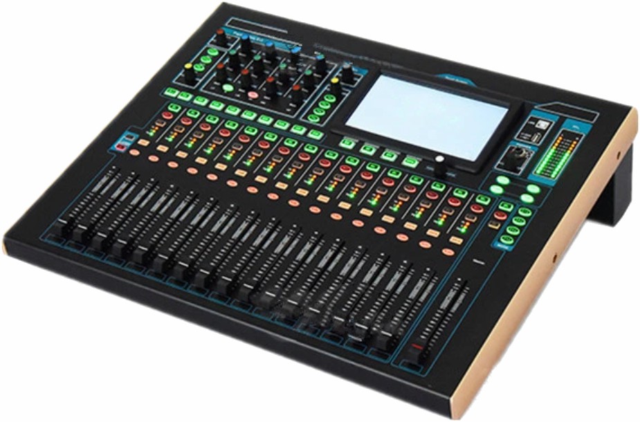 24路信号输入(16MIC数字增益调节、2组立体声、1组返回、声卡/MP3+光纤),内置压限器,噪声门,高低通,4段参数均衡,延时,声像平衡调节,12路信号输出(LR主输出,8编组输出,2辅助输出),4路独立效果器,17个100MM电动推子,内置声卡,4个快捷场景模式调用键,脚踏开关接口,光纤输入/输出,多轨数字录音。7寸触摸屏,支持有线网口调节(或外接路由器无线调节)
